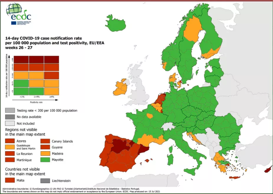 Dijelovi Španjolske, kao i vrlo mali dio Nizozemske, u tamnocrvenoj su boji, koja simbolizira najlošiju epidemiološku situaciju.