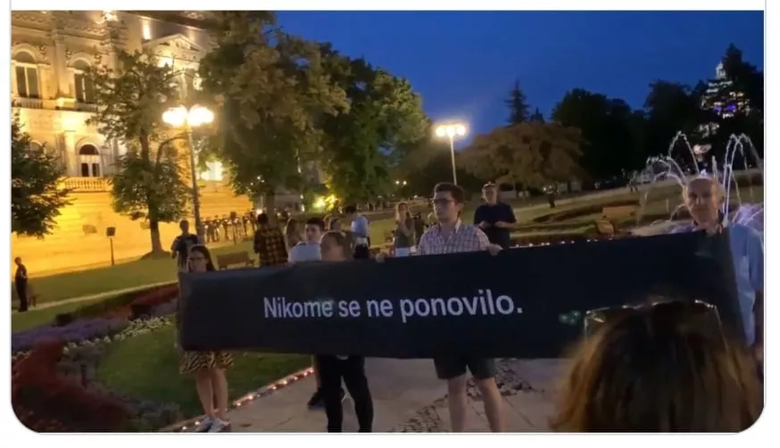 Nevladina Inicijativa mladih za ljudska prava okupila se večeras držeći transparent "Nikome se ne ponovilo".