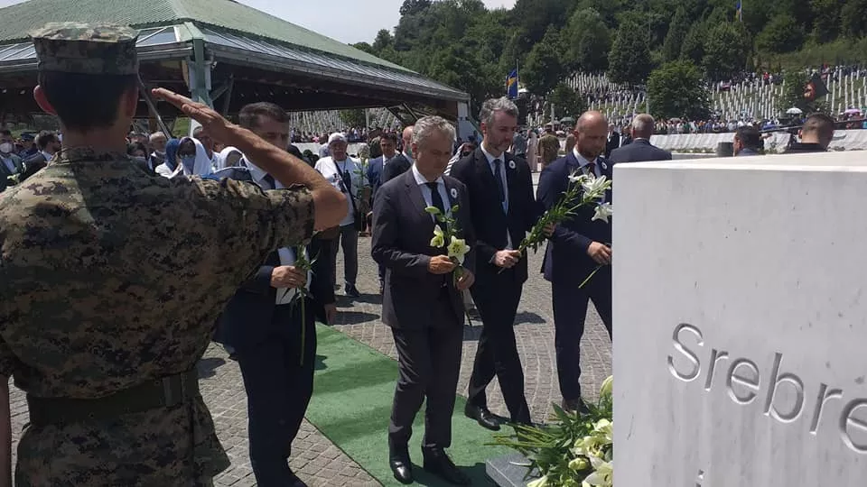 SARAJEVO, (Patria) - Nakon komemoracije zvanice su iz bivše fabrike akumulatora prešli u kompleks Memorijalnog centra Potočari gdje odaju počast žrtvama genocida polaganjem cvijeća na spomen-kamenu.