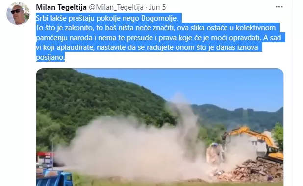 „Srbi lakše praštaju pokolje nego Bogomolje. To što je zakonito, to baš ništa neće značiti, ova slika ostaće u kolektivnom pamćenju naroda i nema te presude i prava koje će je moći opravdati. A sad vi koji aplaudirate, nastavite da se radujete onom što je danas iznova posijano“, napisao je Tegeltija.