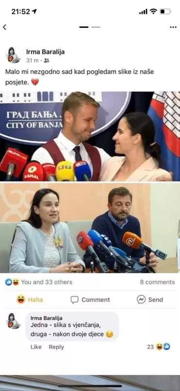 Na svom Facebook profilu Baralija je uz slike Benjamine Karić sa Draškom Stanivukovićem, ali i gradonačelnikom Mostara Marijom Kordićem kojeg je također posjetila napisala kako joj je malo nezgodno kada pogleda slike iz naše posjete. Baralija je (ne)svjesno odabrala slike na kojima su Stanivuković i Karić veseli i u zagrljaju, dok je iz Mostara izabrala jednu sa press konferencije na kojoj su gradonačelnici nešto ozbiljniji. Iako je zagrljaja bilo i u Mostaru, jer je Benjamina jednostavno neposredna, neiskvarena i iskrena Baralija je to zanemarila i u komentaru napisala: „Jedna slika s vjenčanja, druga nakon dvoje djece“.