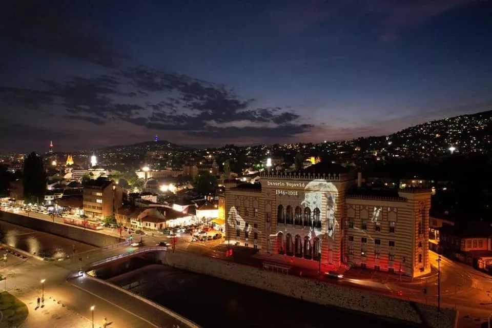 SARAJEVO, (Patria) - Sarajevska Vijećnica večeras je osvijetljena likom Davorina Popovića povodom 20 godina od njegove smrti.
