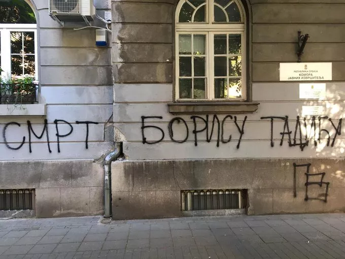 Na grafitima koji su bili ispisani da zidovima u beogradskim naseljima Dorćol i Vračar stajalo je: “Smrt Borisu Tadiću”.