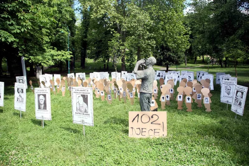 SARAJEVO, (Patria) - Pokret AntiDayton danas je u Velikom parku postavio instalaciju povodom Dana bijelih traka i 102 ubijene djece Prijedora. na 102 kartona u obliku djeteta postavljeno ime i prezime svakog ubijenog djeteta.