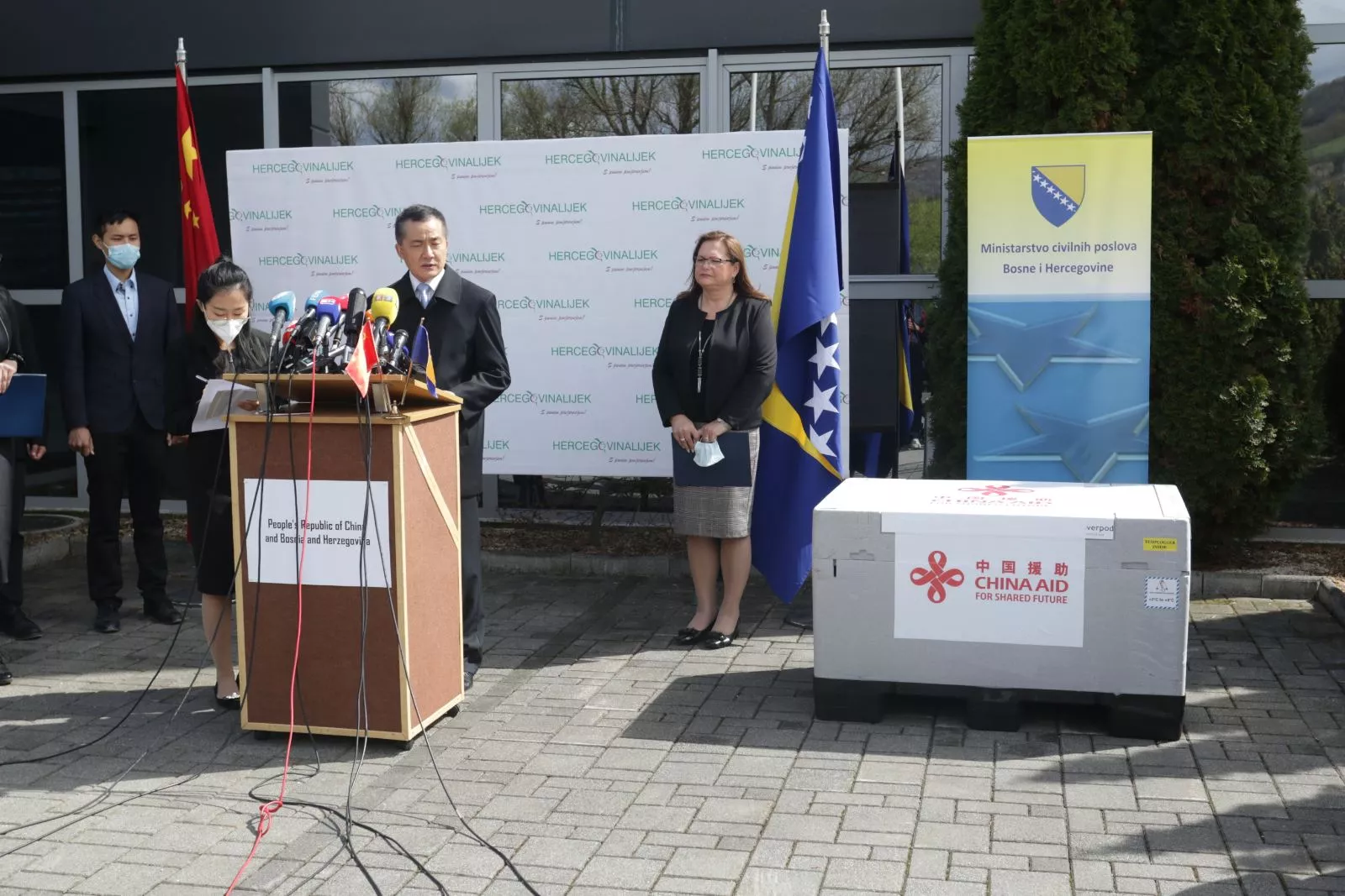 Donaciju je uručio ambasador NR Kine Ji Ping, a u ime države Bosne i Hercegovine je preuzela ministrica civilnih poslova Ankica Gudeljević.