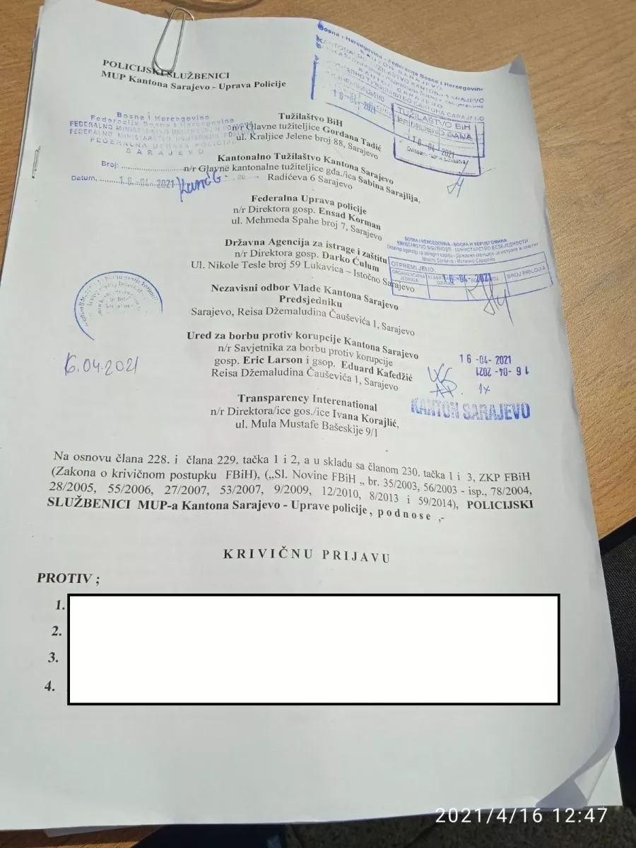 Krivične prijave predate su Tužilaštvu BiH i Kantonalnom tužilaštvu Sarajevo, Federalnoj upravi policije i SIPA-i, Uredu za borbu protiv korupcije KS te Transparency Internationalu.