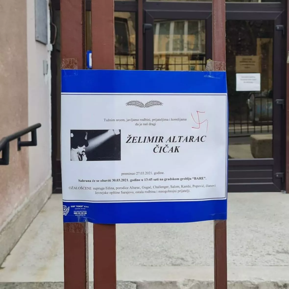 SARAJEVO, (Patria) - Jevrejska opština u Sarajevu oštro osuđuje barbarski čin crtanja kukastog križa na smrtovnicu nedavno preminulog člana Jevrejske opštine Sarajevo i počasnog građanina Grada Sarajeva Želimira Altarca Čička.