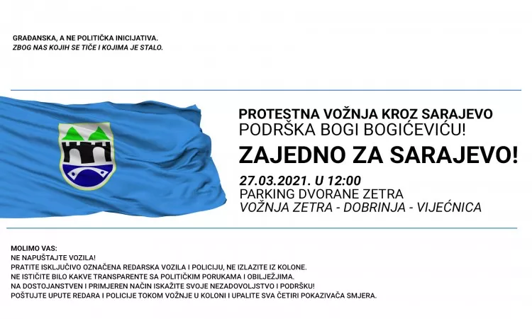 Trasa kreatanja je ZETRA - DOBRINJA - VIJEĆNICA, a nakon toga kod BBI Centra se razilazimo! Okupljanje u 12:00 na parkingu dvorane Zetra! Policija savjetuje, a ja Vas molim, da se ne priključujemo koloni tokom vožnje nego svi da dođemo na parking Zetre! I MOLIM VAS DA POŠTUJETE OVE MJERE TOKOM PROTESTNE VOŽNJE kako ne bi došlo do nekih incidenata od zlonamjernih ljudi!