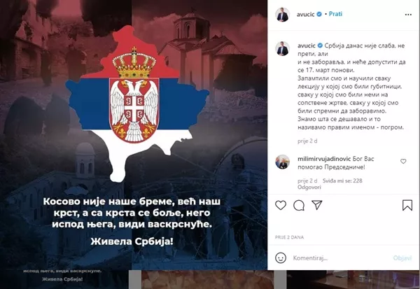 Predsjednik Srbije je ovo objavio povodom godišnjice martovskih nasilja na Kosovu, koji su se desili 17. marta 2004. godine.