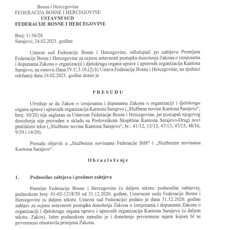 SARAJEVO, (Patria) - Ustavni sud Federacije Bosne i Hercegovine donio je 24. februara presudu da je Zakon o izmjenama i dopunama Zakona i djelokruga organa uprave i upravnih organizacija Kantona Sarajevo neustavan, odnosno da nije saglasan sa Ustavom FBiH i da nije u skladu sa Poslovnikom Skupštine KS. Ustavni sud FBiH presudu je donio po apelaciji koju je uputio federalni premijer Fadil Novalić.