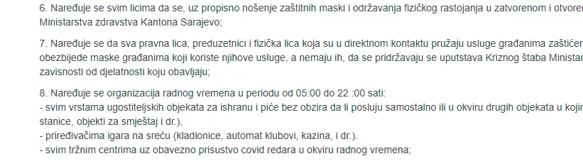 Dozvoljeno radno vrijeme u Kantonu Sarajevo ostaje 23 sata, a ne 22 kako je ranije objavljeno, jer je naredbi poslatoj medijima došlo do navedene štamparske greške.