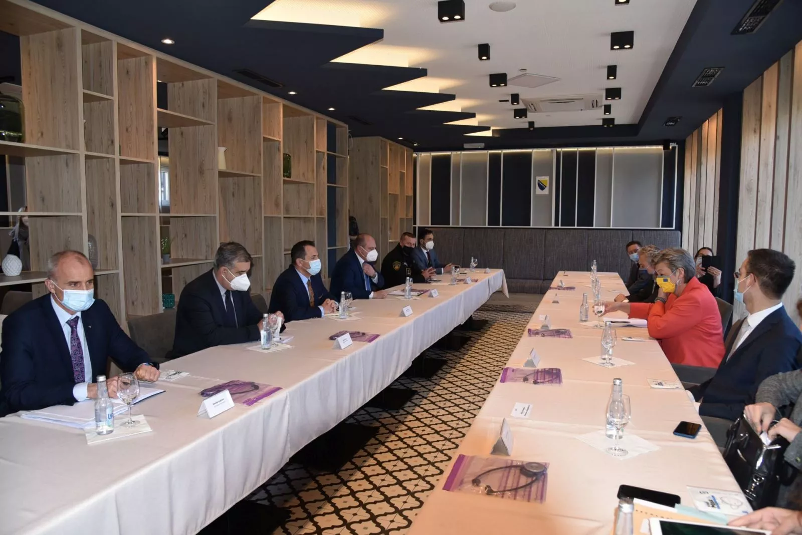 BIHAĆ, (Patria) - Delegacija Ministarstva sigurnosti Bosne i Hercegovine, predvođena ministrom Selmom Cikotićem, sastala se danas u Bihaću s komesarkom Evropske unije za unutrašnje poslove Ylvom Johansson i šefom Delegacije EU u BiH ambasadorom Johannom Sattlerom. Sastanku su prisustvovali i premijer Unsko-sanskog kantona Mustafa Ružnić, gradonačelnik Bihaća Šuhret Fazlić i policijski komesar Unsko-sanskog kantona Mujo Koričić.