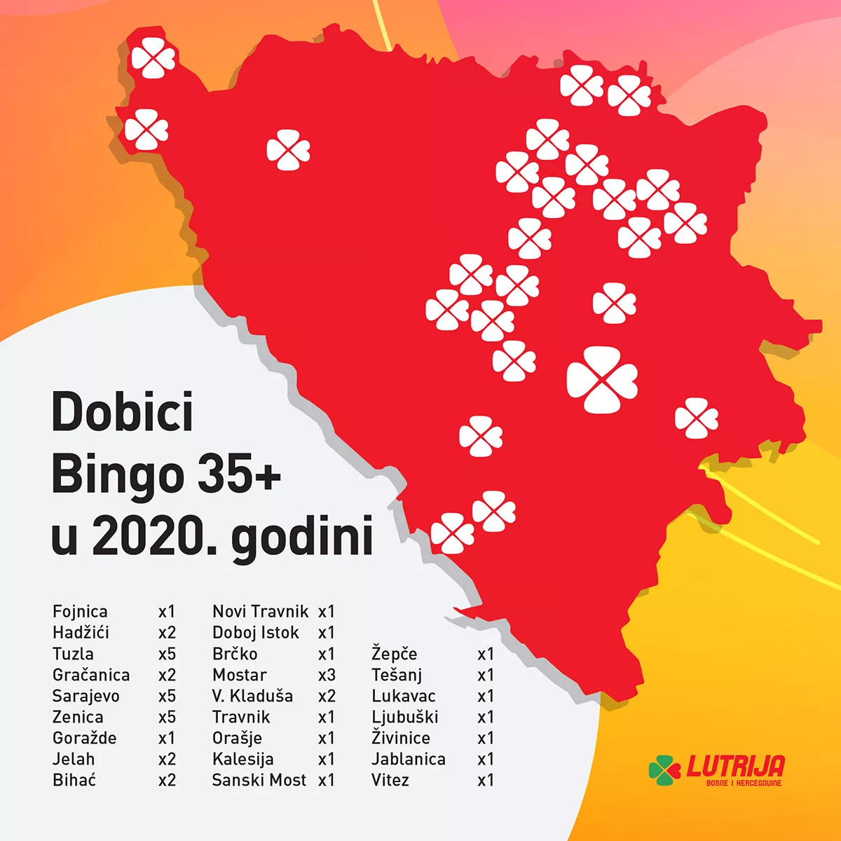 SARAJEVO, (Patria) - Lutrija BiH u 2020. godini isplatila je 697.362 KM za pogotke ostvarene u igri Bingo 35+, a ukupno je takvih dobitaka bilo 40. Po pet dobitaka bilo je u Tuzli, Zenici i Sarajevu, dok su tri bila u Mostaru. Po dva su bila u Gračanici, Bihaću, Velikoj Kladuši, Jelahu, Hadžićima, a po jedan u 16 gradova širom FBiH i Brčko distriktu.