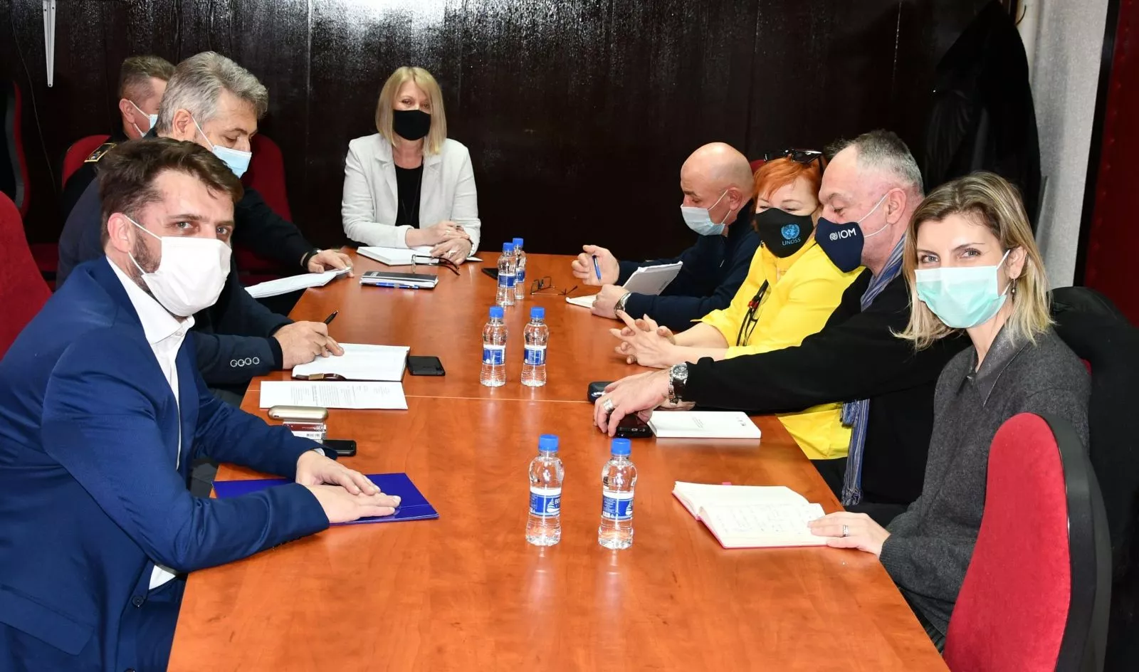SARAJEVO, (Patria) - Ministar unutrašnjih poslova Kantona Sarajevo Admir Katica i policijski komesar Nusret Selimović sa saradnicima održali su danas radni sastanak sa šeficom Misije IOM u Bosni i Hercegovni Laurom Lungarotti. Na sastanku se razgovaralo o načinu implementacije zaključaka Vlade i Skupštine KS u vezi s migrantskom krizom kao i nedavnog sastanka održanog na Ilidži na kojem je prisustvovao i ministar sigurnosti BiH.
