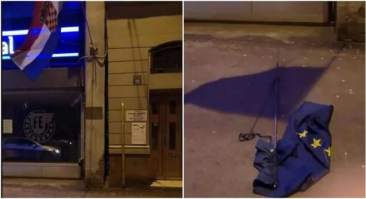Osim zastave koja je skinuta sa nosača i bačena na ulicu, oštećen je i metalni nosač na kojem je stajala zastava.
