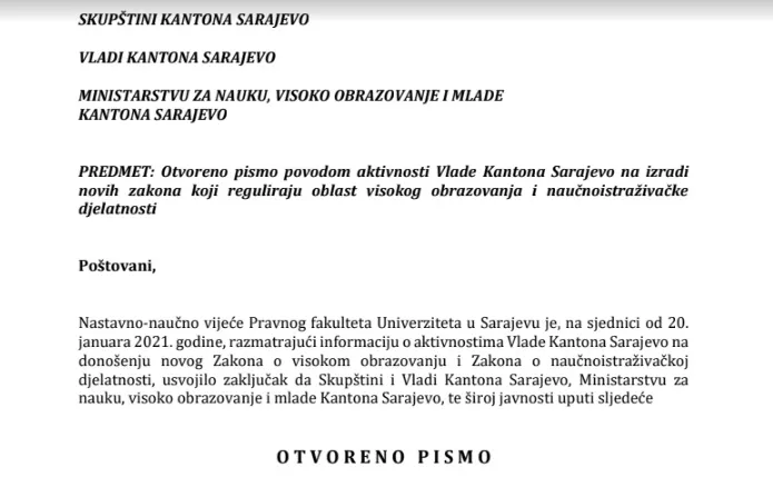 Potpuna transparentnost i institucionalne saradnje s relevantnim naučnim ustanovama u domenu njihove ekspertize predstavljaju preduslov da reforma navedenih oblasti ispuni očekivanja akademske, privredne i šire društvene zajednice u Bosni i Hercegovini. U konačnici, ponovo se referiramo na već spomenuti Ekspoze premijera Vlade i na proklamirane ključne principe djelovanja nove Vlade. Pozivamo Vladu i resorno Ministarstvo da poštuju i dosljedno primjenjuju navedene principe u procesu kreiranja i predlaganja Zakona o visokom obrazovanju i Zakona o naučnoistraživačkoj djelatnosti Kantona Sarajevo", navodi se u pismu koje potpisuju akademsko osoblje Pravnog fakulteta Univerziteta u Sarajevu.