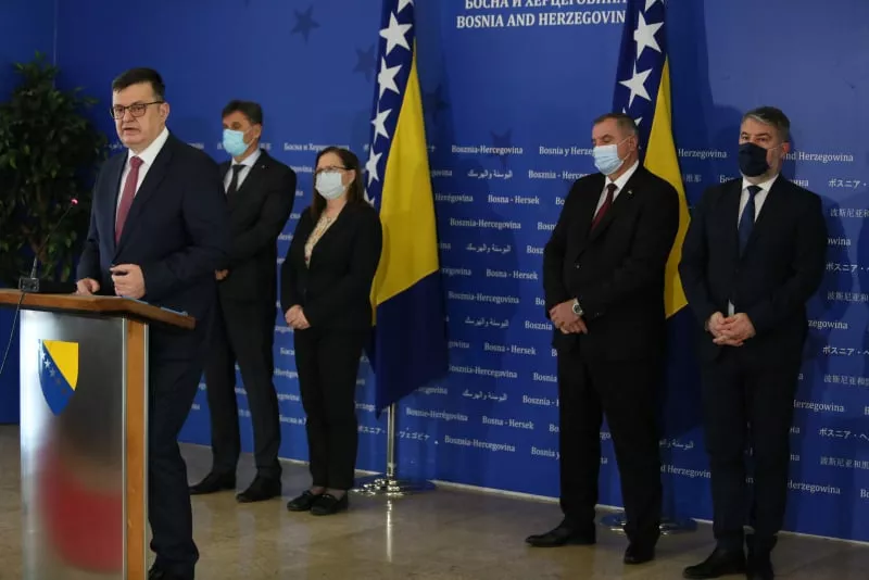 SARAJEVO, (Patria) - Danas je održan sastanak predsjedavajućeg VM BiH Zorana Tegeltije sa premijerima entiteta FBiH Fadilom Novalićem i RS Radovanom Viškovićem i ministrima zdravstva Vjekoslavom Mandićem i Alenom Šeranićem kojem je prisustvovala i ministrica civilnih poslova BiH Ankica Gudeljević na kojem je razgovarano o procesu nabavke vakcine.