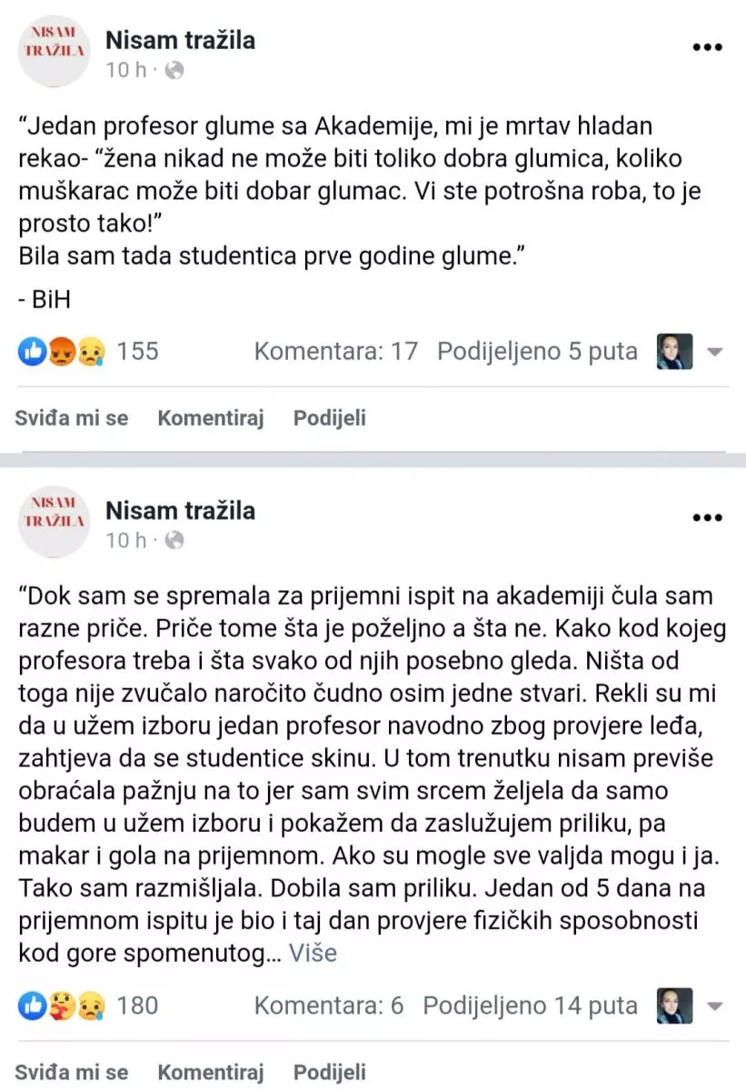 SARAJEVO, (Patria) - Na facebook grupi Nisam tražila koja je pokrenuta prije dva dana nakon priznanja srbijanske glumice Milene Radulović kao i još nekoliko glumica i djevojaka o silovanju koje su doživjele više puta od učitelja glume Miroslava Mike Aleksića dok su pohađale njegovu školu glume, objavljene su brojne potresne priče žena iz regiona koje su također doživjele ponižavanje ili seksualno uznemiravanje. Na toj grupi objavljeno je i nekoliko postova o Akademiji scenskih umjetnosti i metodama određenih profesora na prijemim ispitima. Oglasila se saopćenjem i Akademija scenskih umjetnosti.