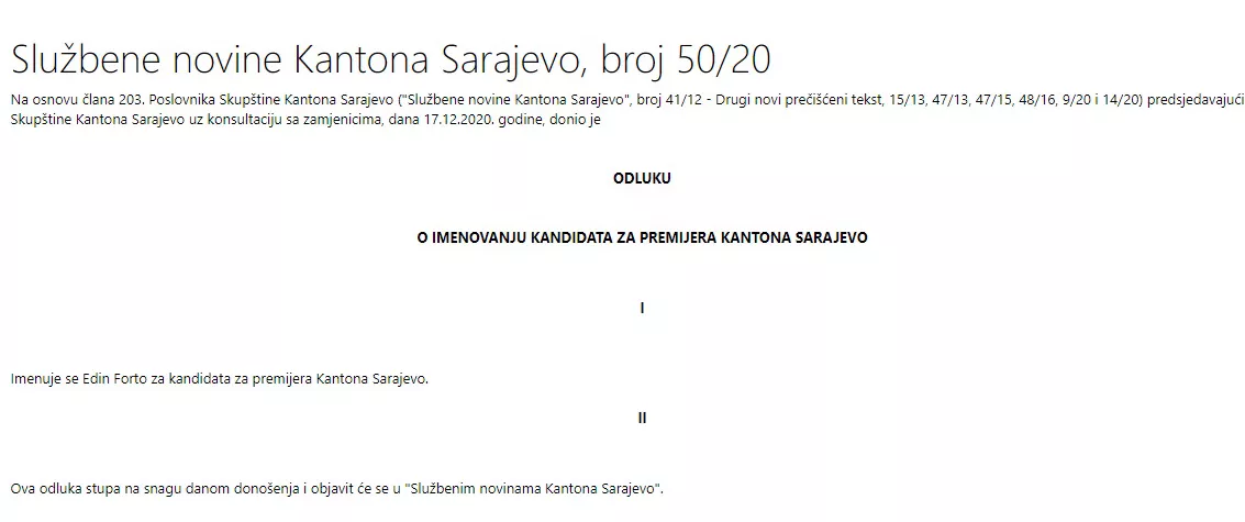 SARAJEVO, (Patria) - U Službenim novinama Kantona Sarajevo objavljena je odluka o imenovanju kandidata Edina Forte za premijera Kantona Sarajevo. Predsjedavajući Skupštine KS Elvedin Okerić odluku je donio 17. decembra, a dan prije je predato ime mandatara.