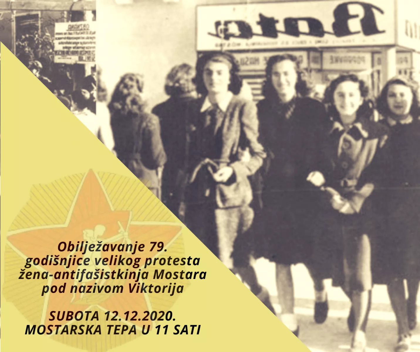 "Pozivamo žene Mostara, prije svih, da se ove subote okupimo na Tepi u 11,00 sati i prisjetimo heroina Mostara koje su 1941. godine imale hrabrosti u okupiranom gradu dići snažan glas i izraziti bunt. Svoj protest simbolično su nazvale Viktorija. Prisjetimo ih se sutra i od Tepe laganom šetnjom prođimo gradom do Partizanskog spomen graoblja. Naoružajmo se cvijetom i položimo ga na posječene cvijetove žena-antifašistkinja Mostara na Partizanskom spomen groblju. Uz poštovanje svih propisanih epidemioloških mjera očekujemo vas sutra na Tepi u 11,00 sati", saopćeno je iz UABNOR-a Mostar.