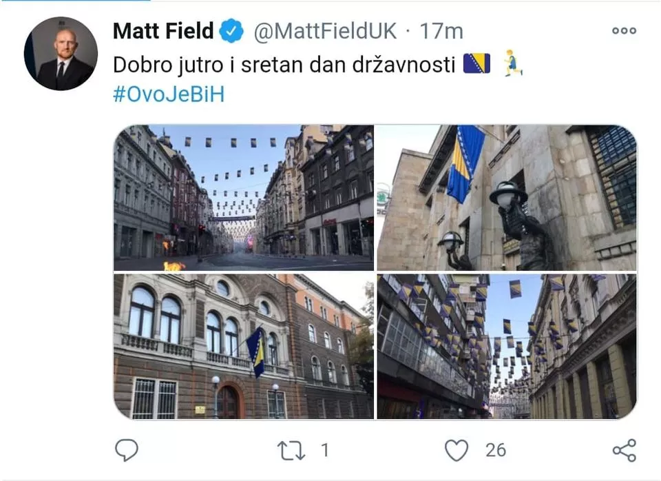 SARAJEVO, (Patria) - Ambasdor Velike Britanije Matt Field čestitao je Dan državnosti BiH. On je objavio četiri fotografije sa zastavama BiH na kojima su Predsjedništvo BiH, Centralna banka BiH, Vječna vatra i ulice Sarajeva koje su okićene zastavama BiH povodom praznika.
