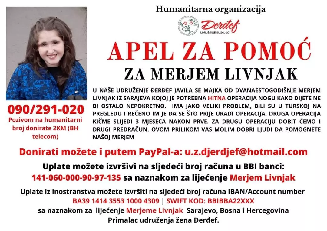 (Patria) - Merjem Livnjak (12) iz Sarajeva neophodna je pomoć dobrih ljudi. Naime, hitno joj je potrebna operacija nogu kako dijete ne bi ostalo nepokretno. Ova učenica OŠ Aleksa Šantić u Sarajevu ima veliki problem, bila je s porodicom u Turskoj na pregledu i rečeno im je da se što prije treba uraditi operacija. Druga operacija kičme slijedi 3 mjeseca nakon prve. Za drugu operaciju dobit ćemo i drugi predračun.