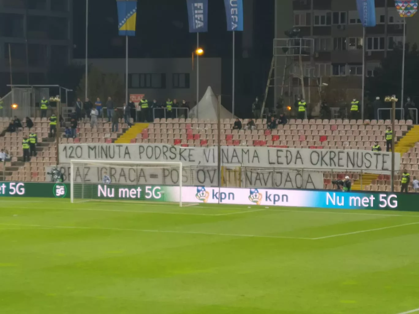 (Patria) - Navijači su na Bilinom Polju raširili transparent sa jasnom porukom za igrače, nakon poraza od Sjeverne Irske. Fanaticosi su prije meča na sjevernoj tribini stadiona Bilino Polje okačili transparent kojim su poručili da su ih naši reprezentativci duboko razočarali jer se nisu htjeli pozdraviti nakon debakla na Grbavici protiv Sjeverne Irske.