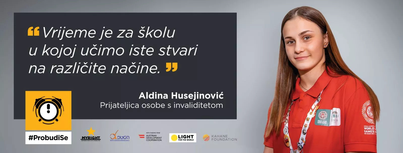 Oni su ti koji žive inkuziju i ličnim zalaganjem štite ljudska prava osoba s invaliditetom. Jedna od lica kampanje „Probudi se“ je i Aldina Husejinović, učenica Druge gimnazije u Sarajevu, koja svojim odnosom prema učenicima s invaliditetom ukazuje na važnost postojanja empatije i uvažavanja drugog i drugačijeg. „Probudite se! Sve što sam treba je volja, upornost, razumijevanje i rad da bismo dobili obrazovni sistem koji širom otvorenih vrata prima i osnažuje