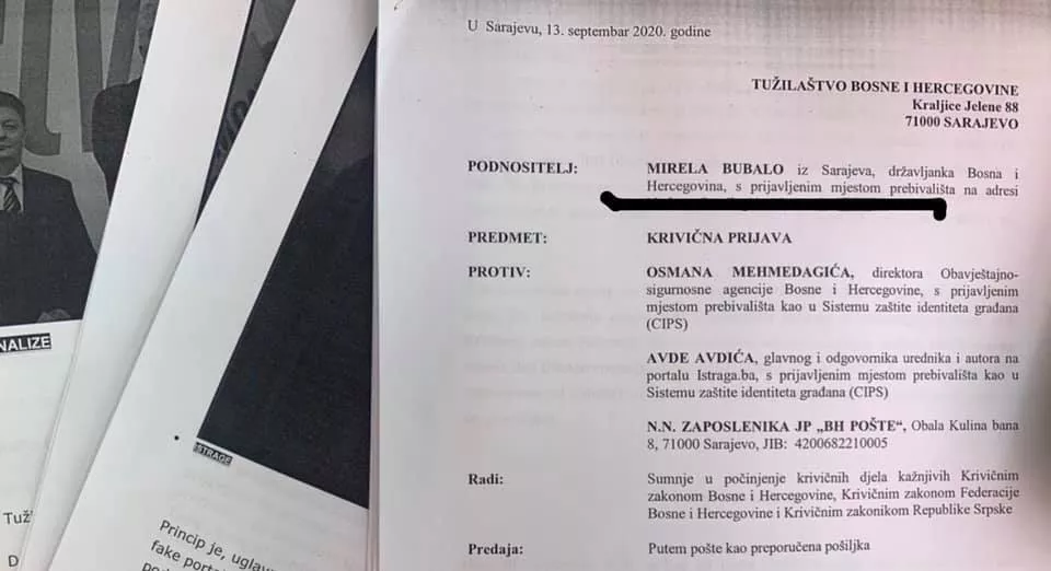 "Krivičnu prijavu sam podnijela protiv Osmana Mehmedagića, Avde Avdića i n.n. lica iz JP „Pošte“ BiH zbog sumnje u počinjenje krivičnih djela kažnjivih Krivičnim zakonom Bosne i Hercegovine, Krivičnim zakonom Federacije Bosne i Hercegovine i Krivičnim zakonikom Republike Srpske, a danas je moj advokat predao i privatnu tužbu za klevetu protiv Avde Avdića i portala Istraga.ba. O meni su na nezakonit način prikupljani lični podaci koji su objavljeni javno - poput adrese, imena majke i oca, ličnih podataka supruga – što govori da je neko iz OSA BiH nezakonito pristupao i Sistemu zaštite identiteta građana (CIPS). U lažnom tekstu o tome da sam podnijela krivične prijave objavljena je adresa mog prebivališta, a otišlo se čak i korak dalje pa je u tekst ugrađena mapa koja pokazuje jasan put do ulaznih vrata mog doma! Zbog satanizacije u režiji Osmana Mehmedagića živim u strahu i moj život pretvoren je u pakao", napisala je Bubalo na svom Facebook profilu.