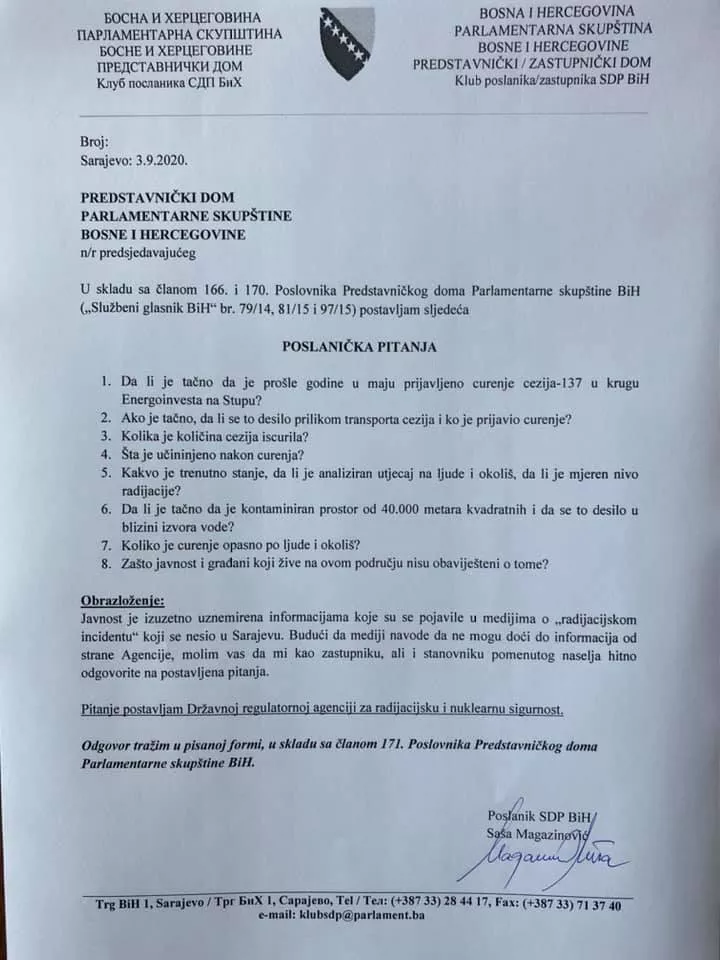 SARAJEVO, (Patria) - Državni zastupnik u Predstavničkom domu PS Saša Magazinović uputio je danas pitanja Državnoj regulatornoj agenciji za radijacijsku i nuklearnu sigurnost u vezi sa radijacijskim incidentom u krugu nekadašnje firme Energoinvest – Termoaparati (TAT) na Stupu.