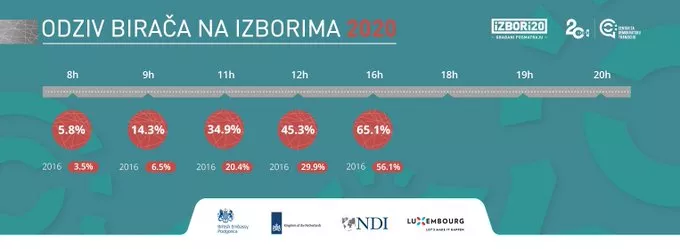 (Patria) - Do 16 sati u Crnoj Gori glasalo je 68,4 posto birača, saopćio je Centar za demokratsku tranziciju (CDT). Kako su naveli, to je za 7,2 posto više nego na parlamentarnim izborima 2016.