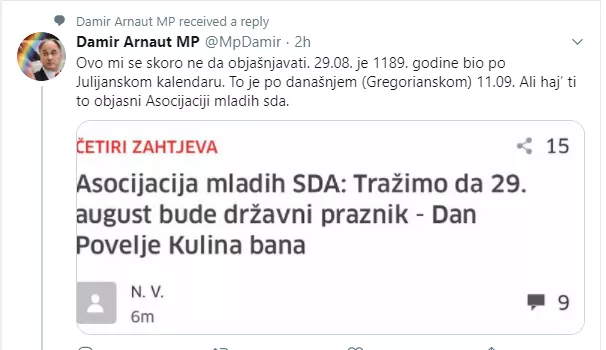 “Ovo mi se skoro ne da objašnjavati. 29. avgust je 1189. godine bio po Julijanskom kalendaru. To je po današnjem (Gregorianskom) 11.09. Ali haj’ ti to objasni Asocijaciji mladih SDA”, napisao je Arnaut.