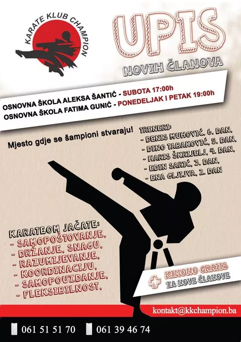 Detalje o upisu novih članova u školu karatea koja je najbliža mjestu vašeg stanovanja možete pronaći na facebook stranici Karate kluba Champion: