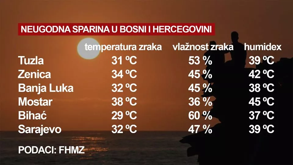 "Probilo je vlage u visinski sloj atmosfere i primjetno je sparnije, a mnogima znatno neugodnije nego jučer. U Mostaru toplotni index (humidex) trenutno iznosi čak 45 ºC, Zenici 42 °C, Tuzli i Sarajevu 39 °C!