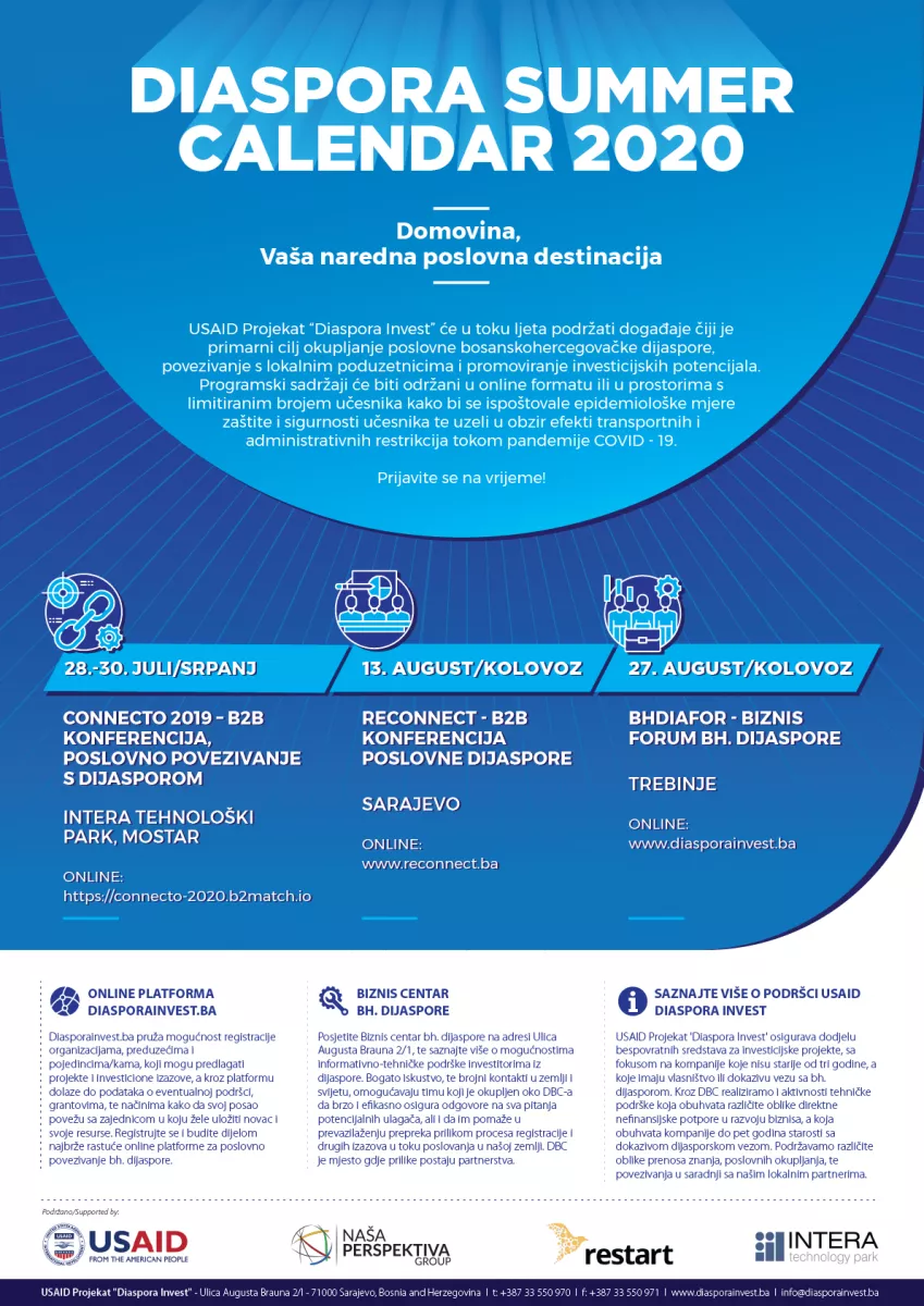 „USAID Projekat „Diaspora Invest“ podržava tri velika događaja ovog ljeta, riječ je konferenciji „Connecto“ u Mostaru u organizaciji Tehnološkog parka INTERA Mostar od 28. do 30. jula, zatim „Reconnect“ u Sarajevu u organizaciji u „Restarta“ 13. augusta, te Biznis forumu bh. dijaspore „BHdiaFor“ u organizaciji „Naše perspektive“ koji je ove godine zakazan za 27. august u Trebinju. Registracija na sva tri skupa je već otvorena, a veći dio aktivnosti će se provoditi putem online komunikacije te u prostorima sa značajno limitiranim brojem učesnika i učesnica“, poručili su iz USAID Projekta „Diaspora Invest“.