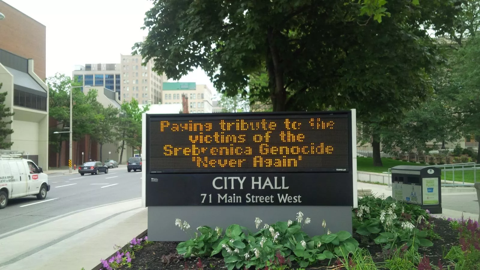 Na panou ispred Skupštine grada Hamiltona, odlukom gradonačelnika Freda Eisenbergera je napisano: “11 juli Dan sjećanja na Genocid u Srebrenici. Odajemo počast žrtvama genocida u Srebrenici”.U znak sjećanja na žrtve genocida u Srebrenici odlukom gradonačelnika na jarbol ispred zgrade Skupštine grada Hamiltona je podignuta zastava BiH. Istovremeno veliki simbol grada Hamiltona je u bijeloj i zelenoj boji, simbolizirajući Cvijet Srebrenice.