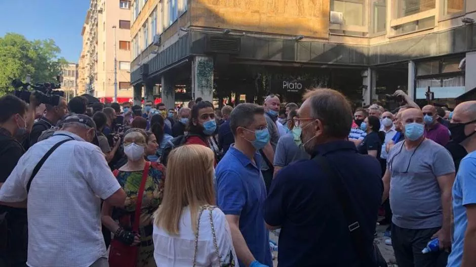 Ispred SzS prvo se obratio Janko Veselinović koji je pročitao zahtjeve - kao prvi, imenovanje novog, kako je rekao, "depolitizovanog Kriznog štaba kome će ljudi vjerovati".