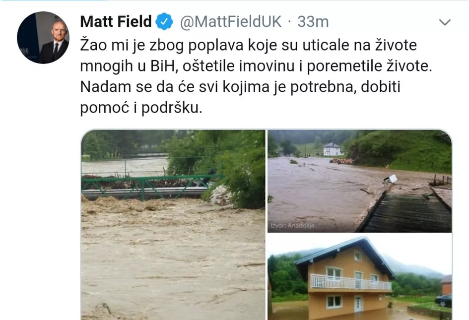 O poplavama koje su zahvatile BiH oglasio se i britanski ambasador Matt Field. On je na svom twitteru objavio nekoliko fotografija poplava izražavajući žaljenje zbog situacije koja je poremetila živote.