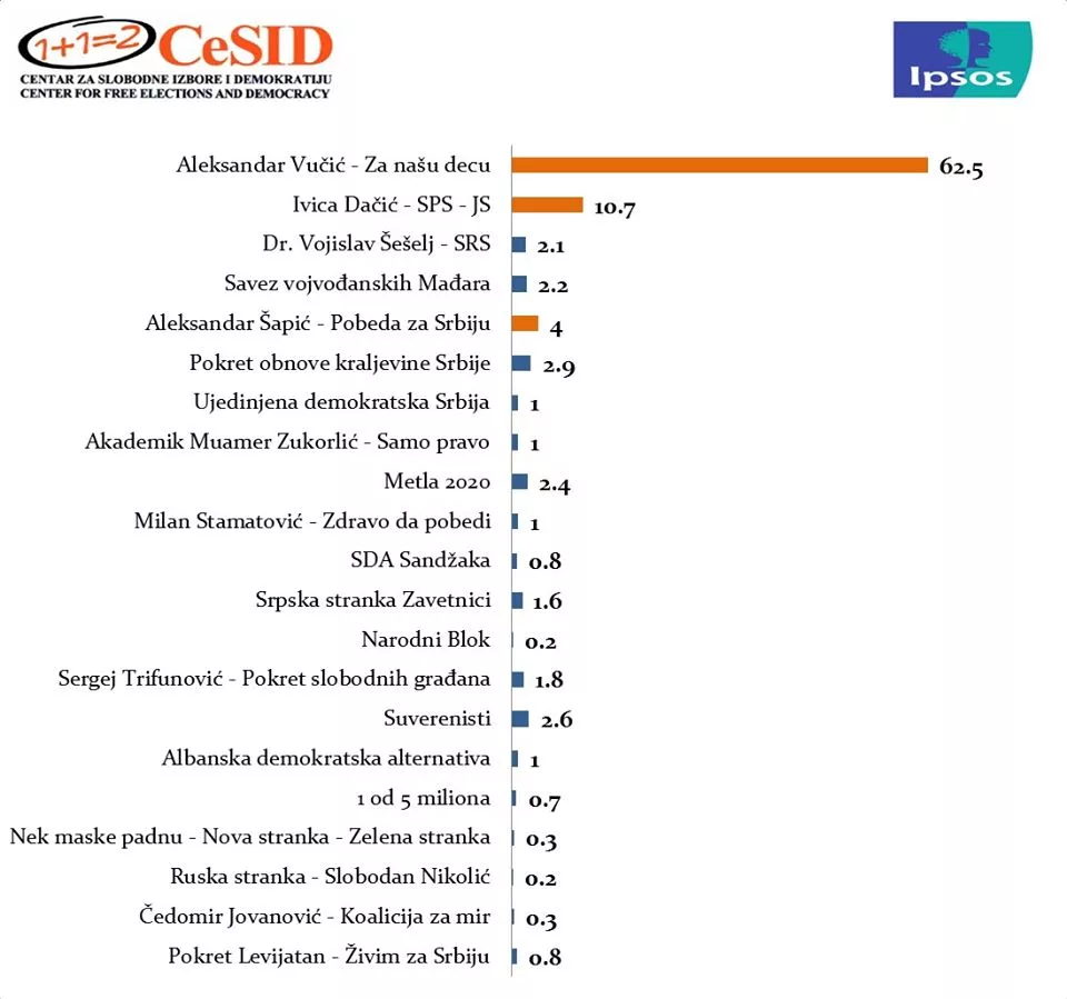 Rezultati Ipsosa i Cesida na osnovu 60,6 odsto obrađenog uzorka: SNS: 63,5 odsto, SPS-JS: 10,7 odsto, SPAS: 4,1 odsto, POKS: 2,9 odsto, Suverenisti: 2,6 odsto, Metla: 2,5 odsto, SRS: 2,1 odsto, SVM: 2,1 odsto glasova.