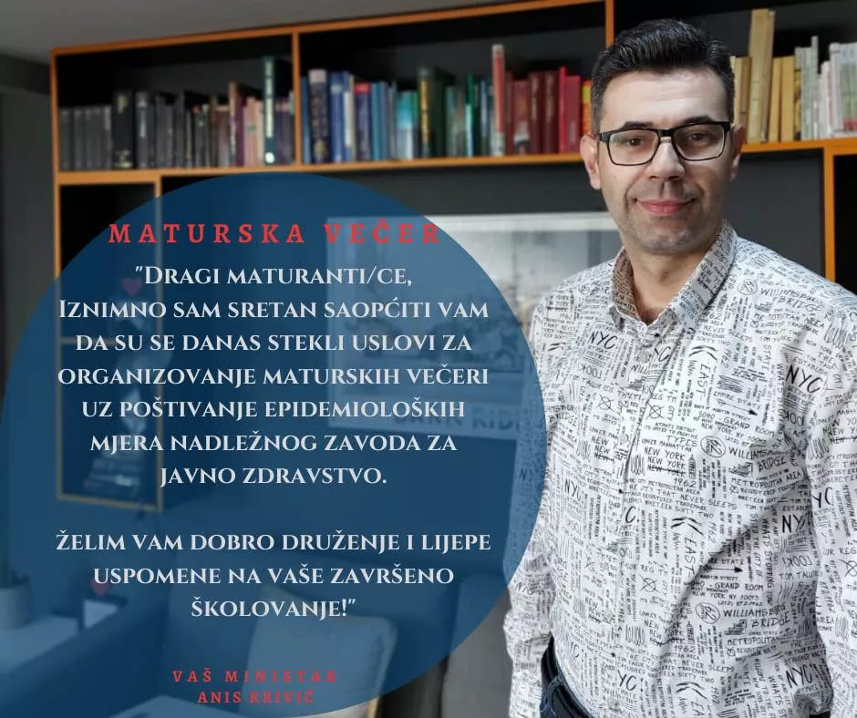 SARAJEVO, (Patria) - Anis Krivić, ministar za obrazovanje, nauku i mlade Kantona Sarajevo, danas je putem Facebook stranice Ministarstva poručio maturantima da su se danas stekli uvjeti za održavanje maturskih večeri uz poštivanje epidemioloških mjera.