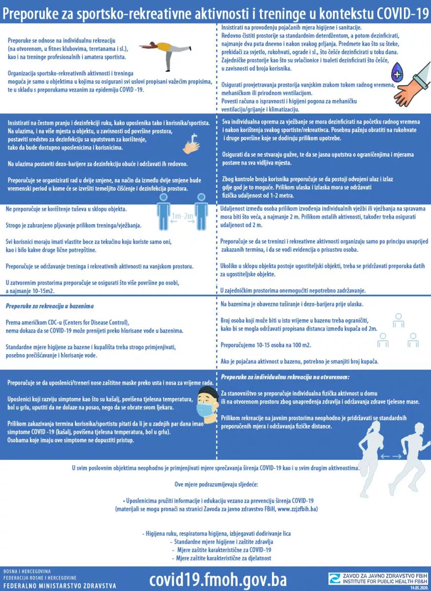 SARAJEVO, (Patria) - Federalni zavod za javno zdravstvo izdao je ažurirane “Preporuke za sportsko-rekreativne aktivnosti i treninge u kontekstu COVID-19” s dodatkom preporuka za bazene.