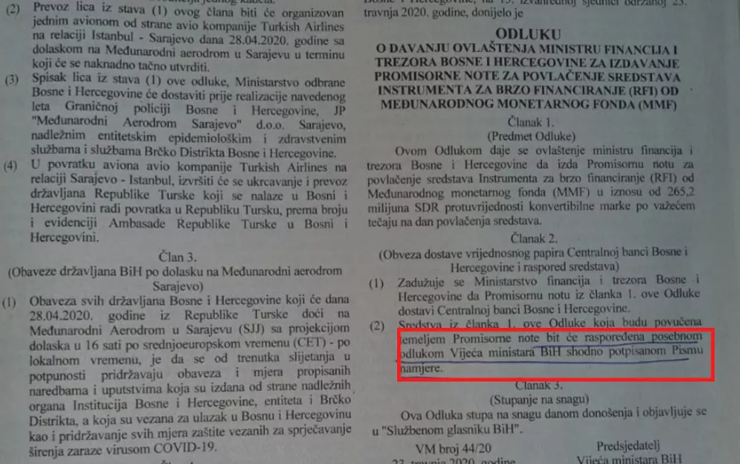 Na dnevnom redu sjednice Upravnog vijeća nema ove tačke dnevnog reda, ali Centralna banka nije prava adresa, nego Vijeće ministara BiH. Odluka koju je propisao premijer Zoran Tegeltija i koja je objavljena u Službenom listu broj 26/20 u članu 2. Odluke navodi se da će sredstva od MMF-a biti povučena na osnovu Promisorne note posebnom odlukom Vijeća ministara BiH shodno potpisanom Pismu namjere.