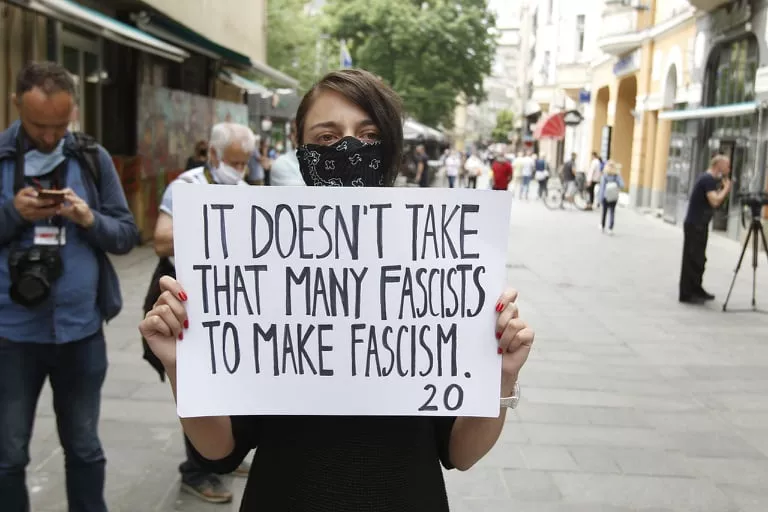 Policijski službenici koji osiguravaju prostor oko katedrale upozorili su mirne demonstrante da se udalje od zaštitne ograde, što su oni i učinili. "Ustaše su fašisti jedan je od plakata koje nose demonstranti.