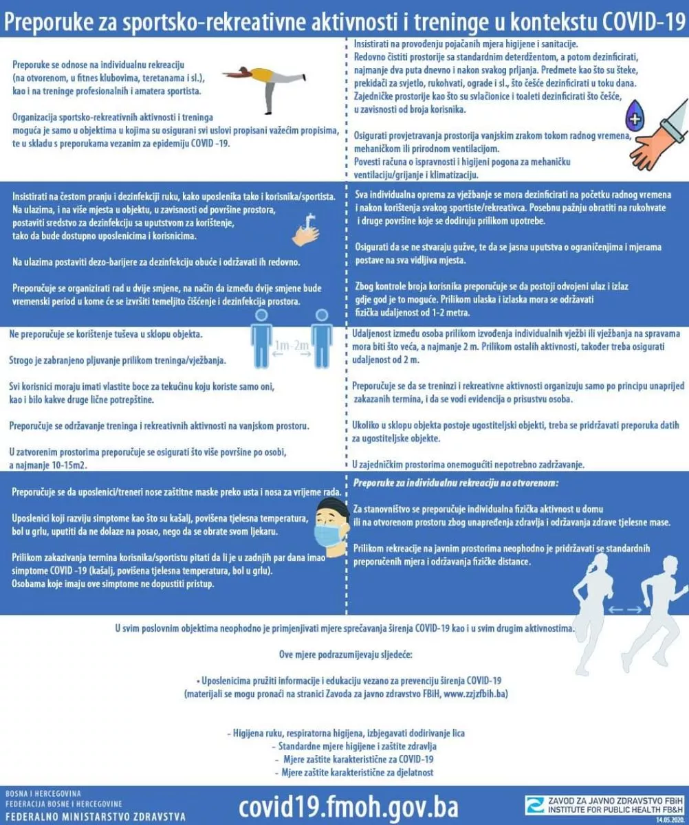 (Patria) - Federalni štab civilne zaštite dozvolio je trenažne procese sportistima na području Federacije BiH, a Zavod za javno zdravstvo izdao je preporuke za sportsko-rekreativne aktivnosti i treninge.