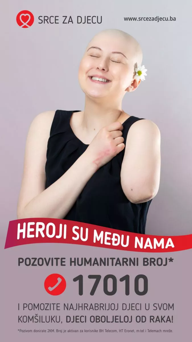 Djeca oboljela od raka nisu sama uz dobre ljude Bosne i Hercegovine, uz svoje dobre komšije, najhumanije sugrađane. Pomozite jednom heroju da lakše pobijedi zlo koje je okupiralo njegov svijet. Pomozite djeci oboljeloj od raka jednim jednostvnim pozivom na humanitarni broj 17010. Pozivom donirate 2KM, a broj je važeći za korisnike mreža BH Telecom, HT Eronet, mTel i Telemach.
