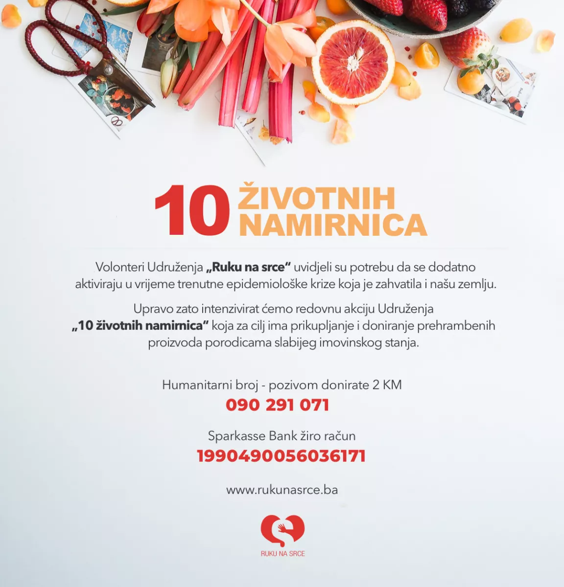 Donacije za ovu akciju moguće je uplatiti na broj žiro računa 1990490056036171 (Sparkasse Bank d.d. BiH, primalac: Udruženje “Ruku na srce”, adresa: Hakije Turajlića 33, Sarajevo, svrha uplate: Za akciju „10 životnih namirnica“).