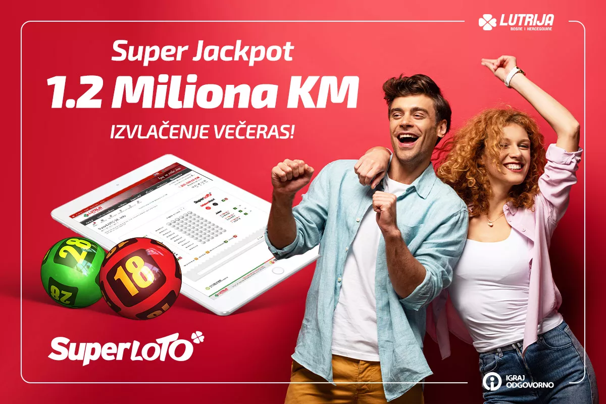 SARAJEVO, (Patria) - U večerašnjem 28. kolu igre SuperLOTO igrače očekuju brojni novčani dobici. Posebno se ističe Super Jackpot koji iznosi nevjerovatnih 1.200.000 KM, a osvojit će ga igrač koji pogodi svih 6 brojeva i jednu od ponuđenih boja-crnu ili crvenu. Za igrače koji odluče odigrati i boju, statistika kaže da je u prethodnih 27. kola crna boja izvučena 16 puta, a crvena 11 puta.