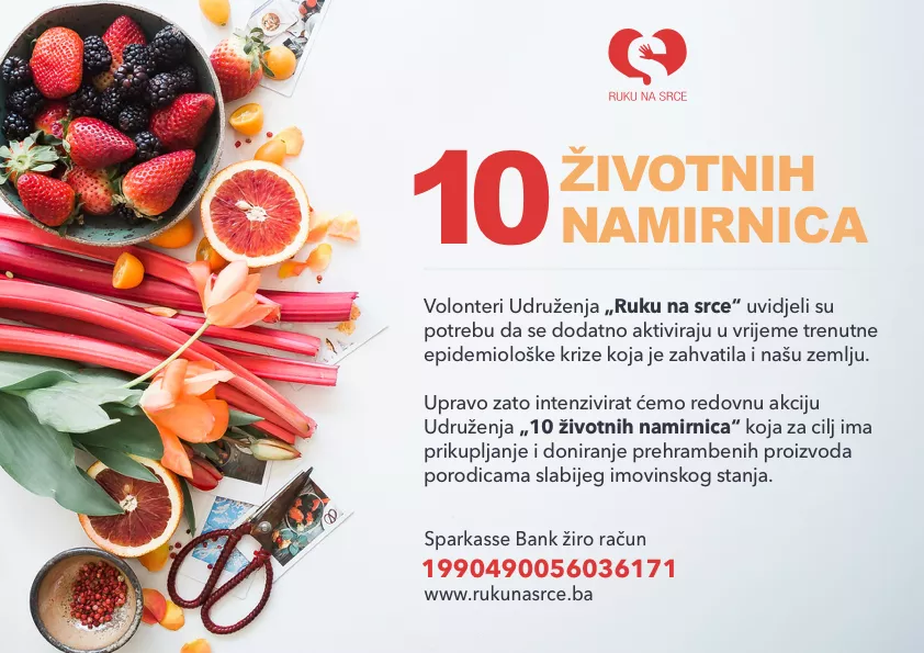 SARAJEVO, (Patria) - Volonteri Udruženja „Ruku na srce“ uvidjeli su potrebu da se dodatno aktiviraju u vrijeme trenutne epidemiološke krize koja je zahvatila i našu zemlju. Upravo zato intenzivirat će redovnu akciju Udruženja „10 životnih namirnica“ koja za cilj ima prikupljanje i doniranje prehrambenih proizvoda slabijeg imovinskog stanja.