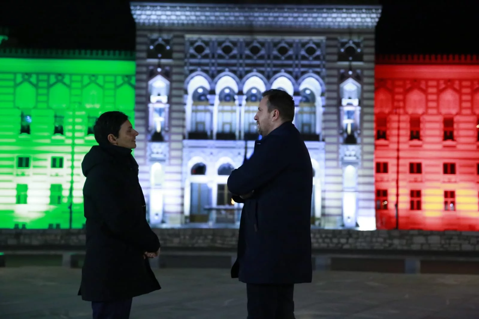SARAJEVO, (Patria) - Italijanski ambasador u BiH Nicola Minasi i gradonačelnik Sarajeva Abdulah Skaka bili su prisutni ispred Vijećnice kada su upaljena svjetla u boji italijanske zastave.
