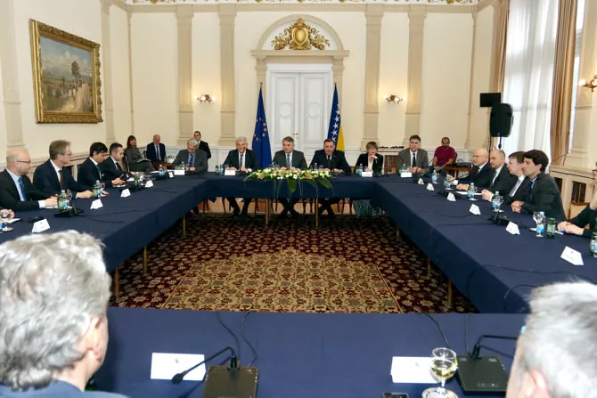 SARAJEVO, (Patria) - Šef Delegacije EU u BiH i specijalni predstavnik EU, ambasador Johann Sattler i šefovi misija EU u Bosni i Hercegovini sastali su se danas sa članovima Predsjedništva BiH kako bi razgovarali o naporima kojim bi se iskoristio politički zamah za napredak zemlje na putu ka pridruživanju EU, a u svjetlu 14 ključnih prioriteta iz Mišljenja Evropske komisije o zahtjevu Bosne i Hercegovine za članstvo u EU.